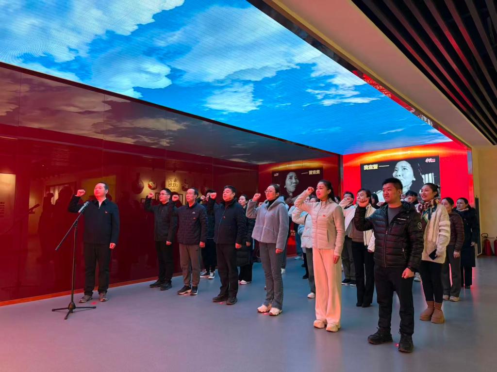 在展馆尾厅,面对鲜红党旗,孔养涛书记带领全体党员举起右拳重温入党誓词。铿锵誓言凝聚着党员们坚守信仰、廉洁从教的坚定承诺,进一步强化了党性修养与责任担当。